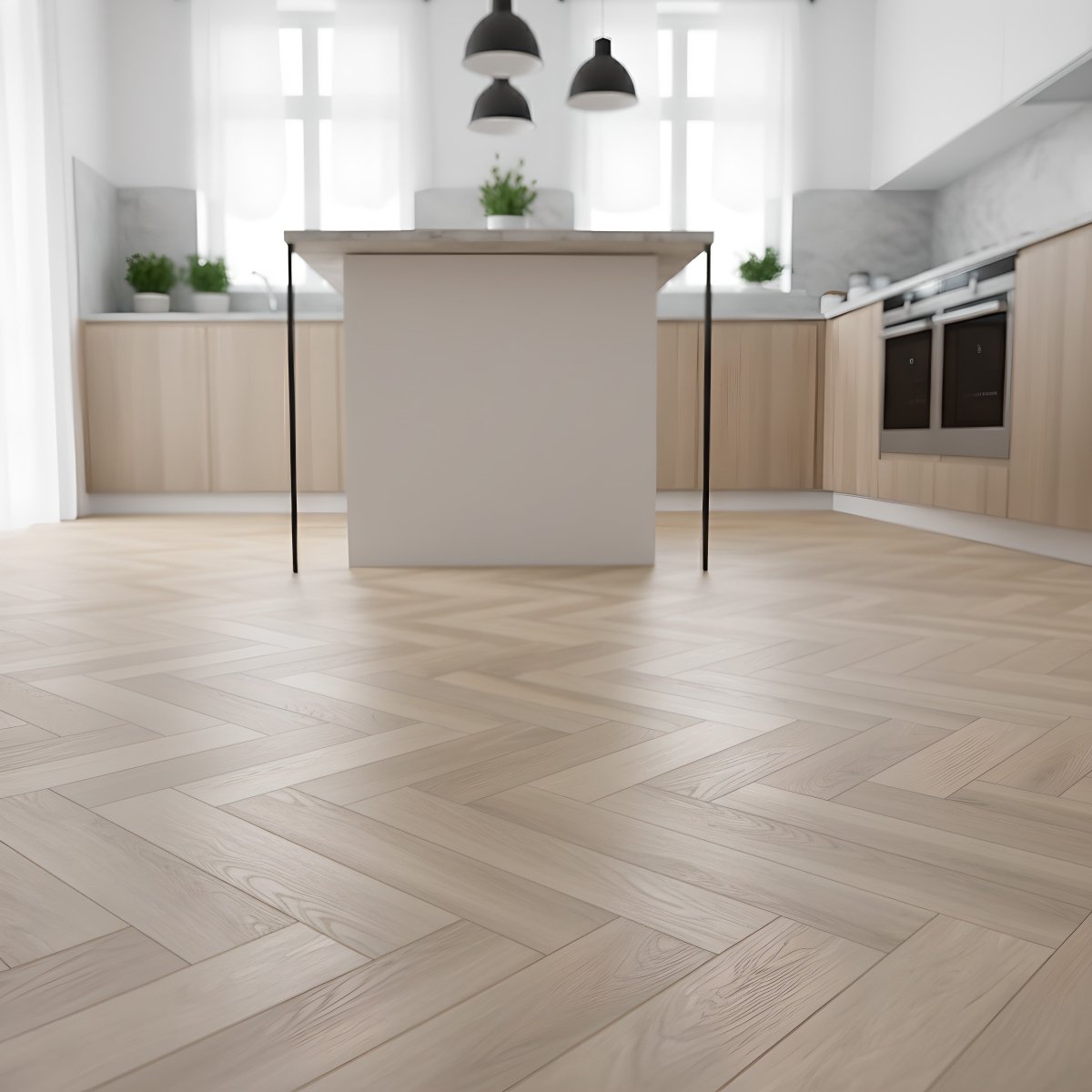 The Vintage Oak Herringbone SPC flooring in light oak combines timeless style with outstanding durability.