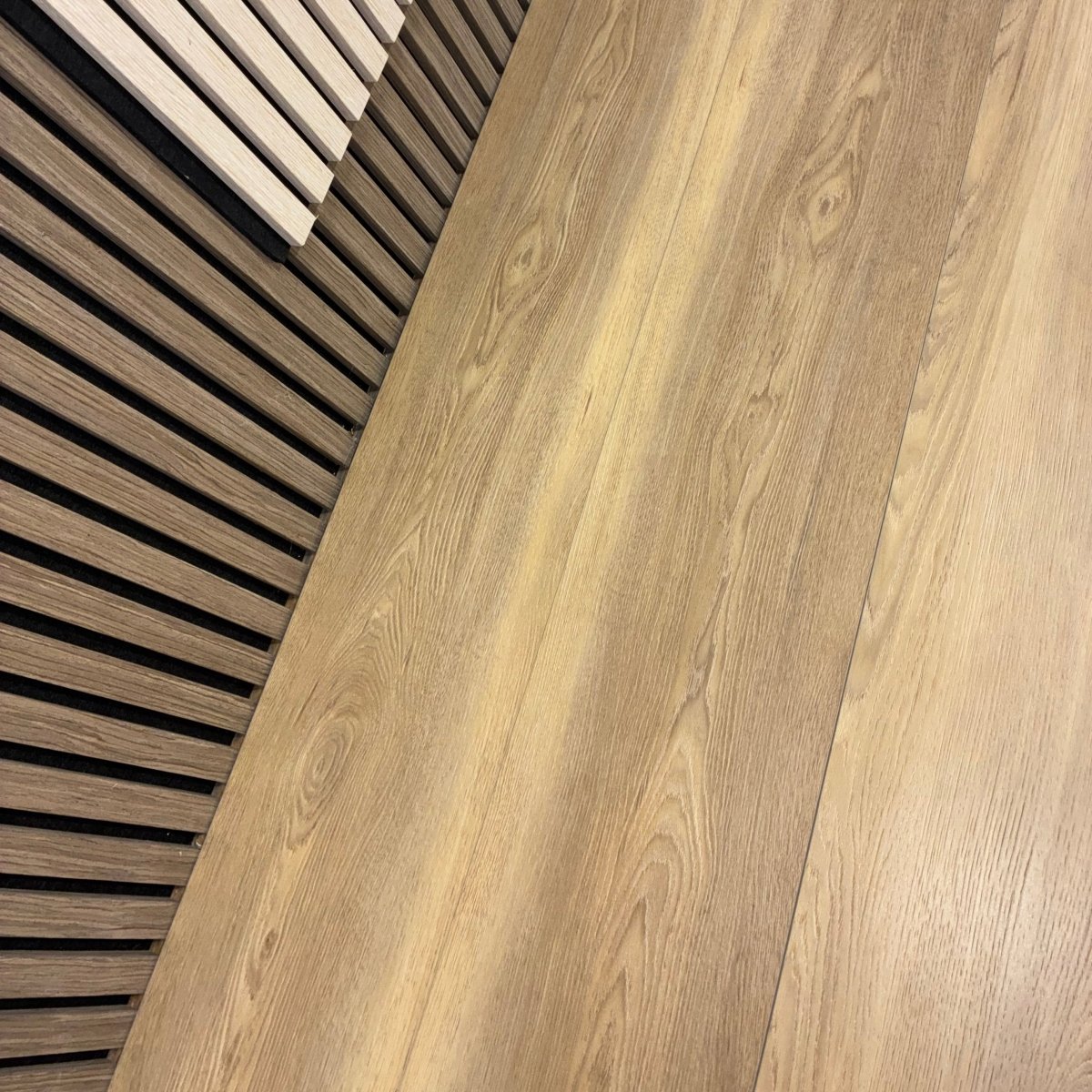 It has a realistic oak grain texture with a natural matt finish that looks like real wood and is easy to maintain.